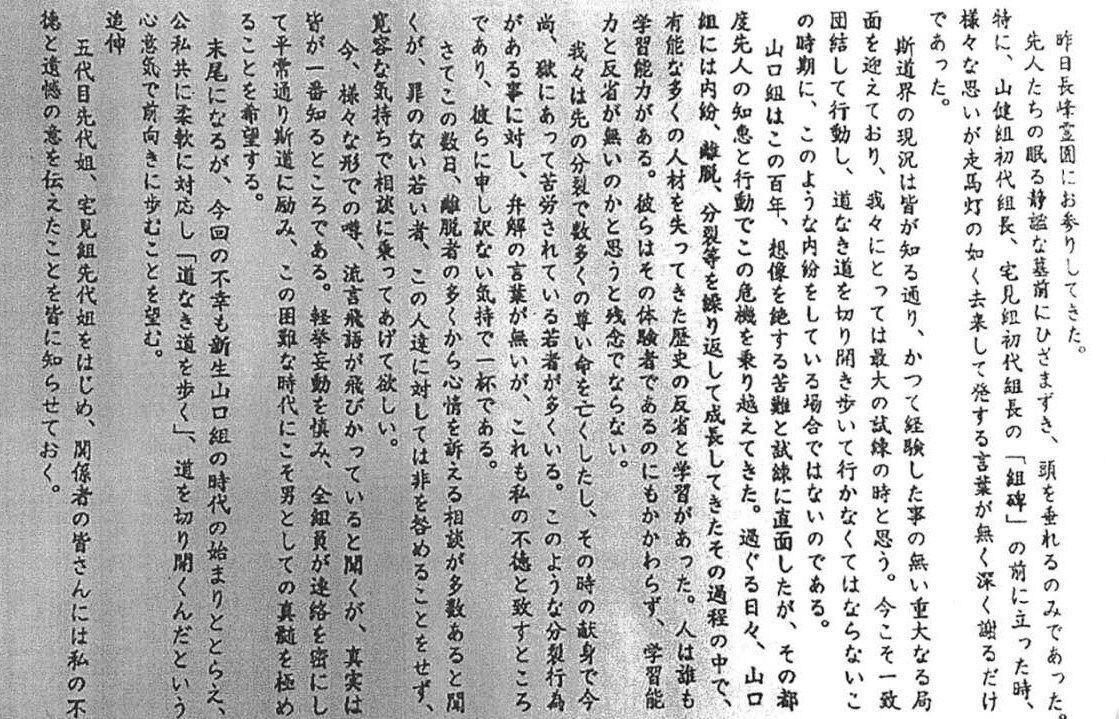 その記事の中で、六代目山口組の定例会で全直参に配られた司組長からの手紙の画像がアップされている。